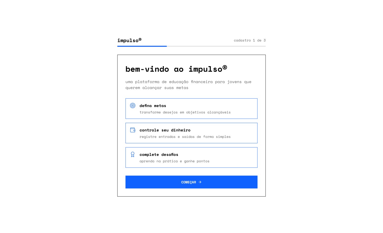 Para evitar o churn logo no primeiro acesso, quebrei o formulário longo em etapas rápidas. A linguagem coloquial (ex: "como devemos te chamar?") cria proximidade e diminui a barreira de entrada para o jovem.